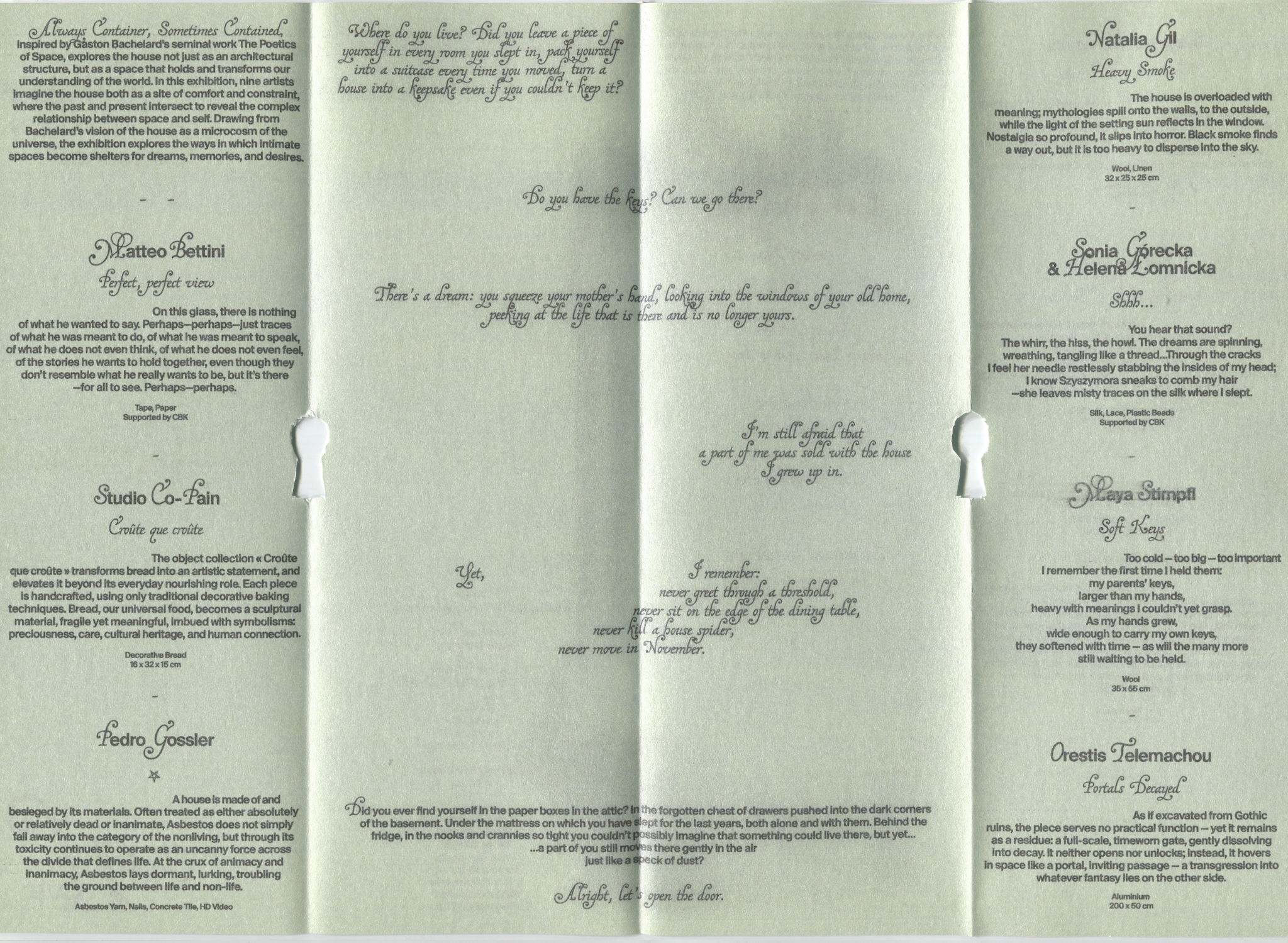 Inspired by Gaston Bachelard’s seminal work The Poetics of Space (1958), the exhibition examines the house not only as an architectural structure, but as a space that holds and transforms our understanding of the world. Drawing from Bachelard’s vision of the house as a microcosm of the universe, the exhibition explores the ways in which intimate spaces become shelters for dreams, memories, and desires. Through various works, the artists imagine the house both as a site of comfort and constraint, where the past and present intersect to reveal the complex relationship between space and self.