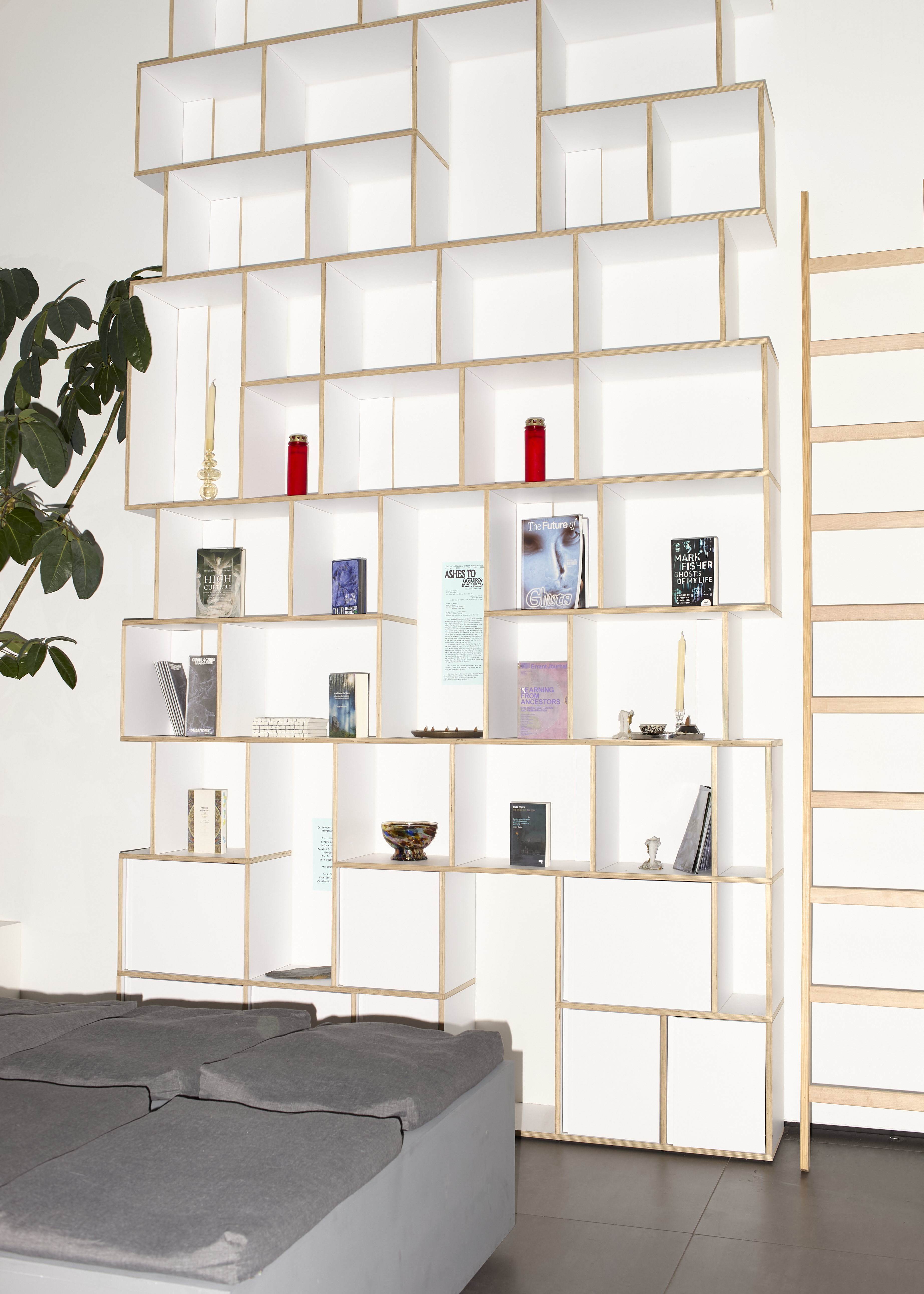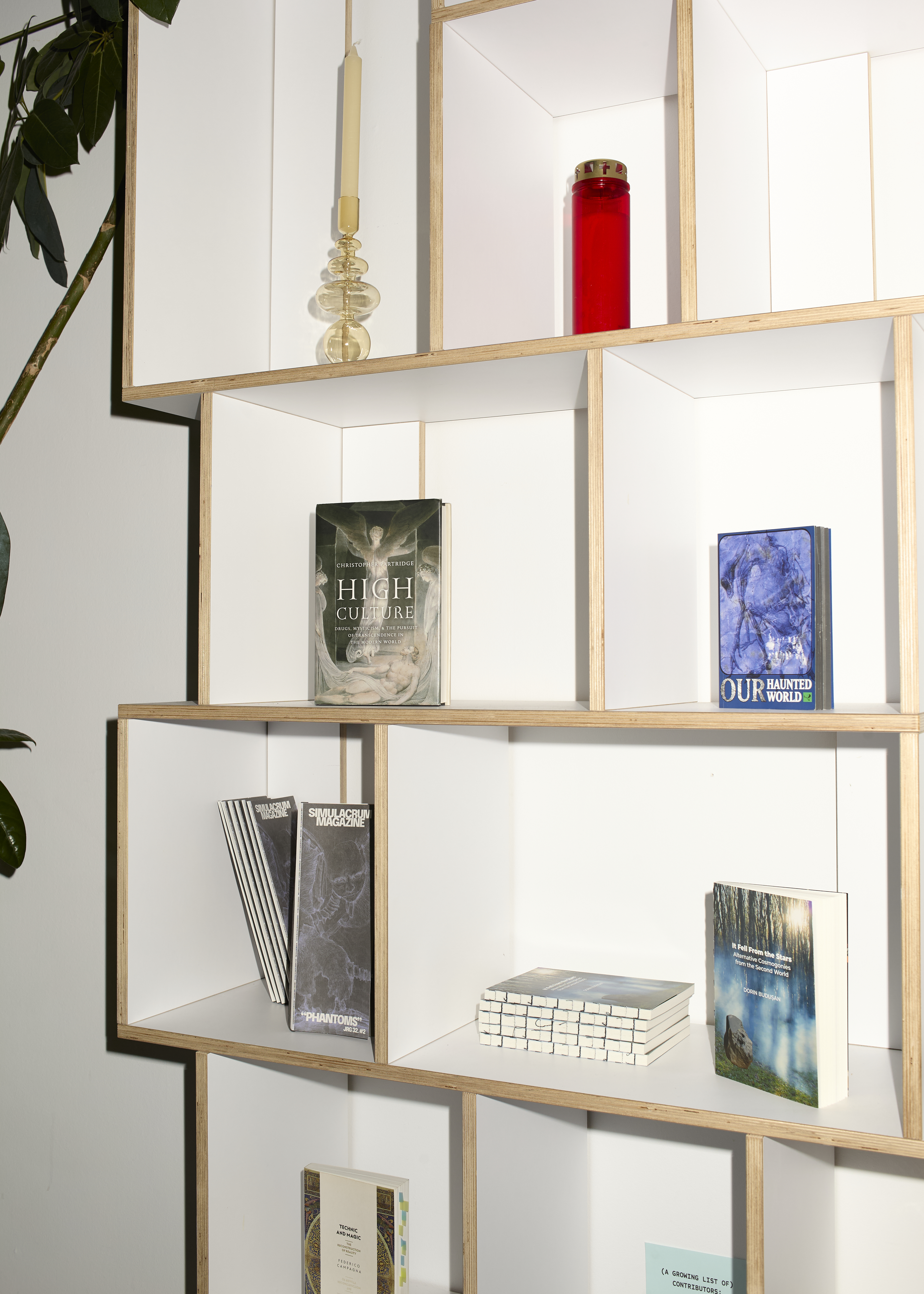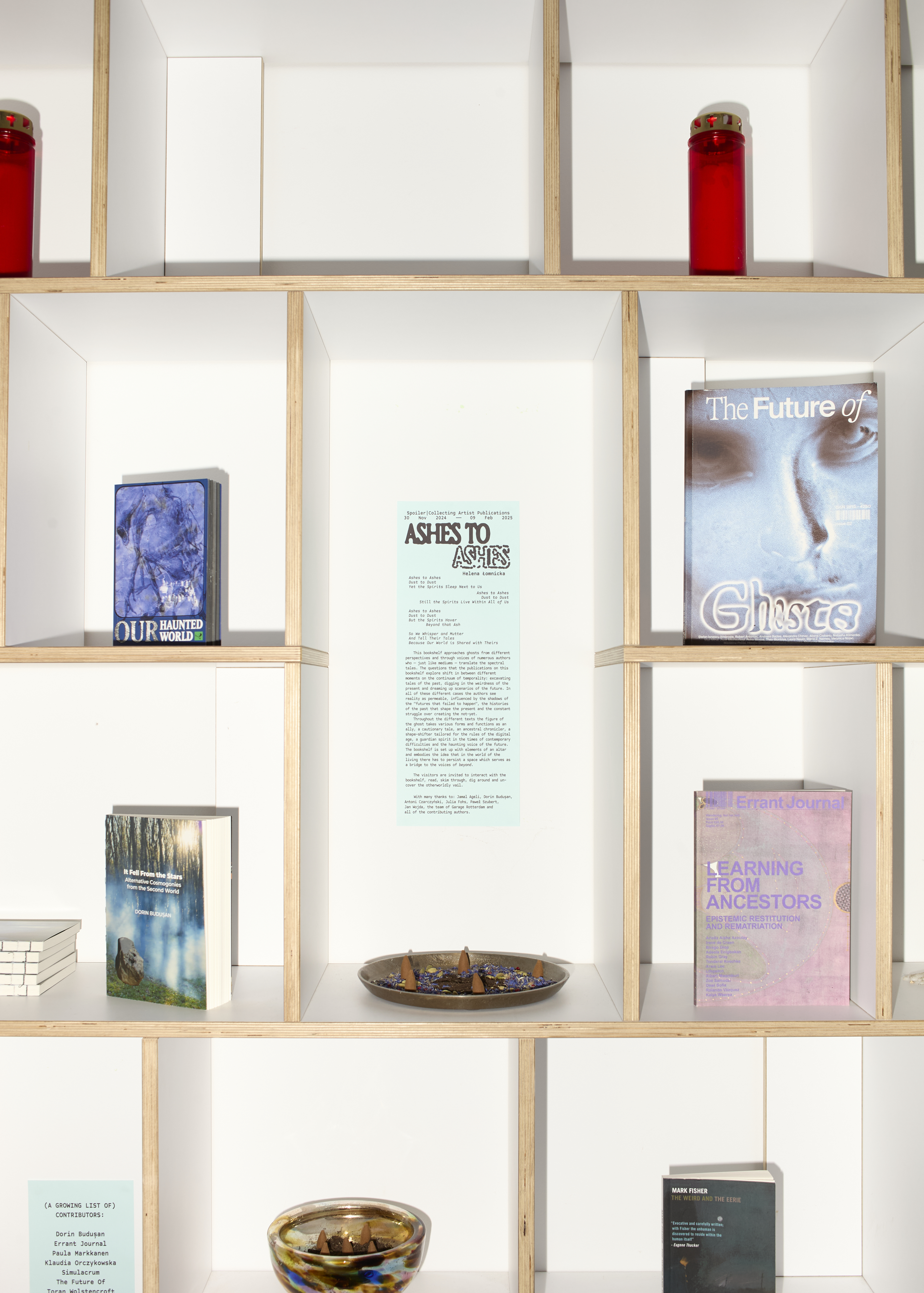 Throughout the different texts the figure of the ghost functions as an ally, a cautionary tale, an ancestral chronicler, a shape-shifter tailored for the rules of the digital age, a guardian spirit in the times of contemporary difficulties and the haunting voice of the future. The bookshelf is set up with elements of an altar and embodies the idea that in the world of the living there has to persist a space which serves as a bridge to the voices of beyond. The visitors are invited to interact with the bookshelf, read, skim through, dig around and uncover the otherworldly vail.